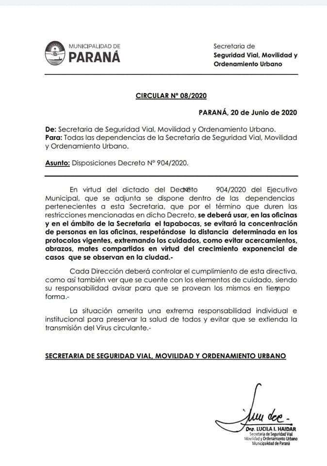 Los trabajadores deberán evitar acercamientos, abrazos y compartir mates. Por otro lado se deberá garantizar el abastecimiento de los elementos de higiene y prevención en tiempo y forma. Por otro lado la atención seguirá manteniendo la misma modalidad con turnos previos sacados desde la página web de la Municipalidad de Paraná